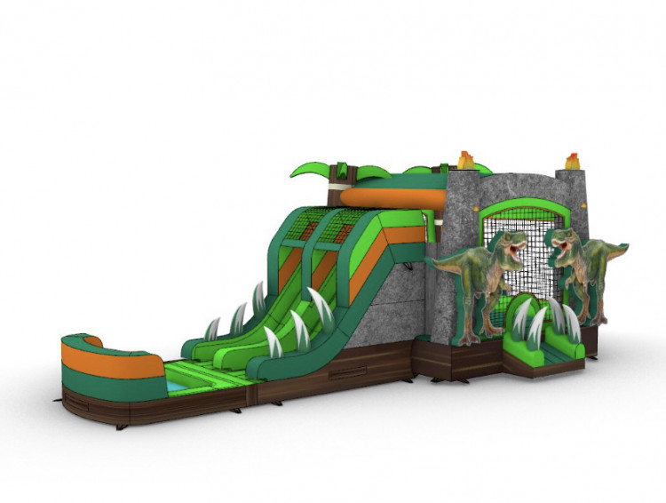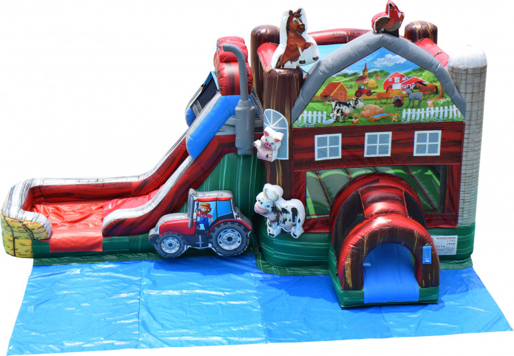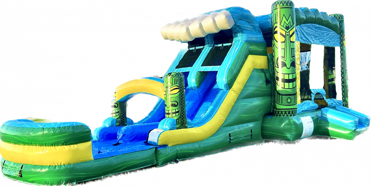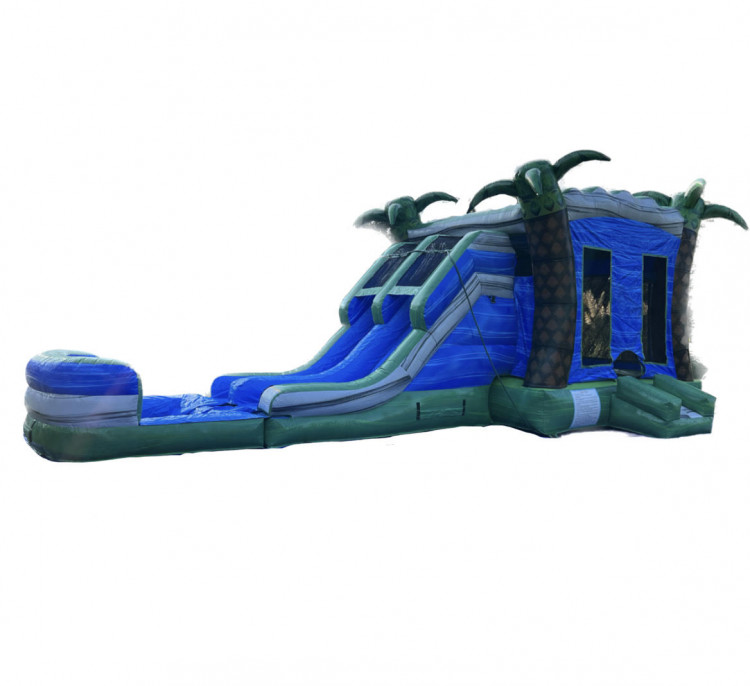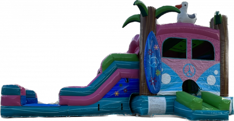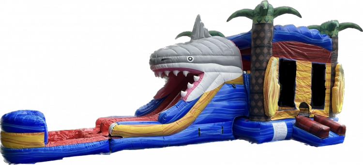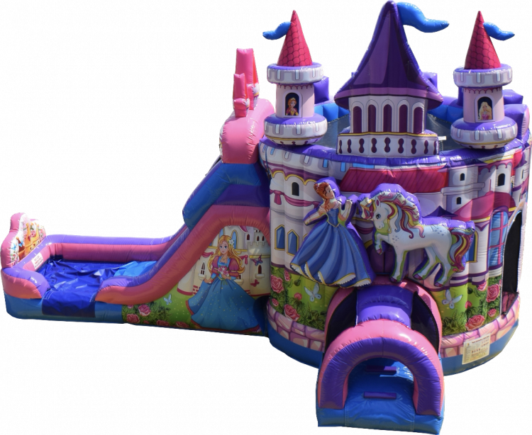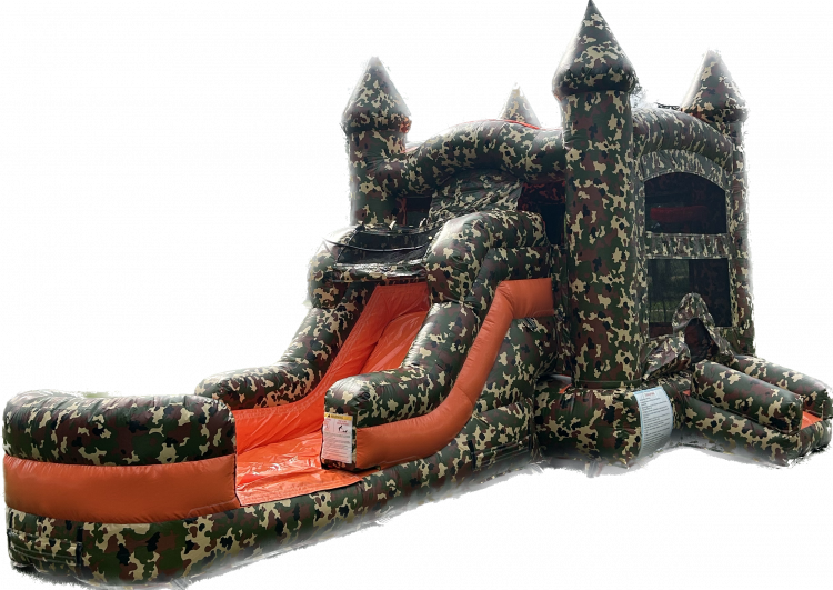 MUST CHOOSE WET OR DRY OPTION. A bounce house and water slide combo combines a bounce house and a water slide into one inflatable play structure. These combo units typically feature a large bouncing area, along with a slide that can be wet down for added excitement. They are popular rentals for outdoor events such as birthdays, family gatherings, and community festivals and provide hours of entertainment for children and adults alike. The inflatable nature of the bounce house and water slide combo makes them easy to set up and take down, and they can be safely used by children of various ages with proper supervision.